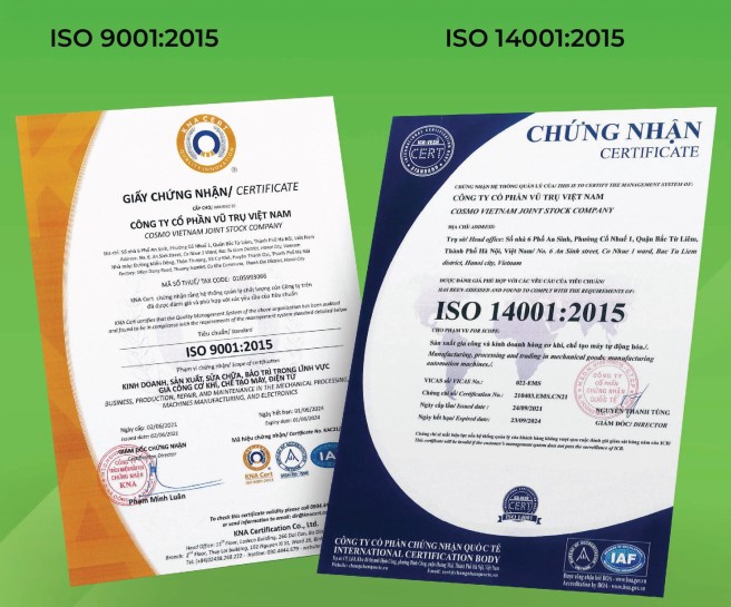 - Cosmovina với đội ngũ kỹ thuật hơn 10 năm kinh nghiệm và đã đạt chứng nhận ISO 9001:2015 về hệ thống quản lý chất lượng cũng như chứng nhận ISO 14001:2015 về hệ thống quản lý môi trường.