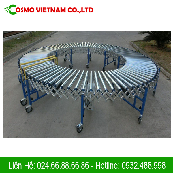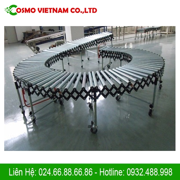 - Băng tải con lăn xếp thường được đặt trên các container, xe tải để tiện lợi trong quá trình xuất hàng dựa vào tính kéo giản của hệ thống khung.