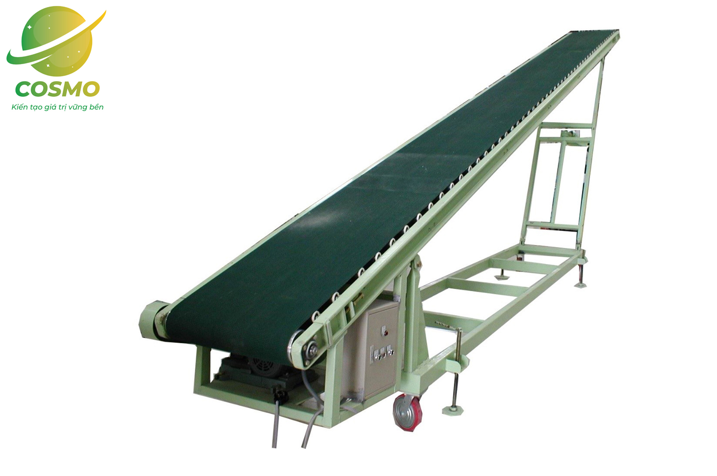 Sản phẩm băng tải nghiêng có thiết kế chắc chắn, khả năng di chuyển dễ dàng trên nhiều địa hình không giống nhau.