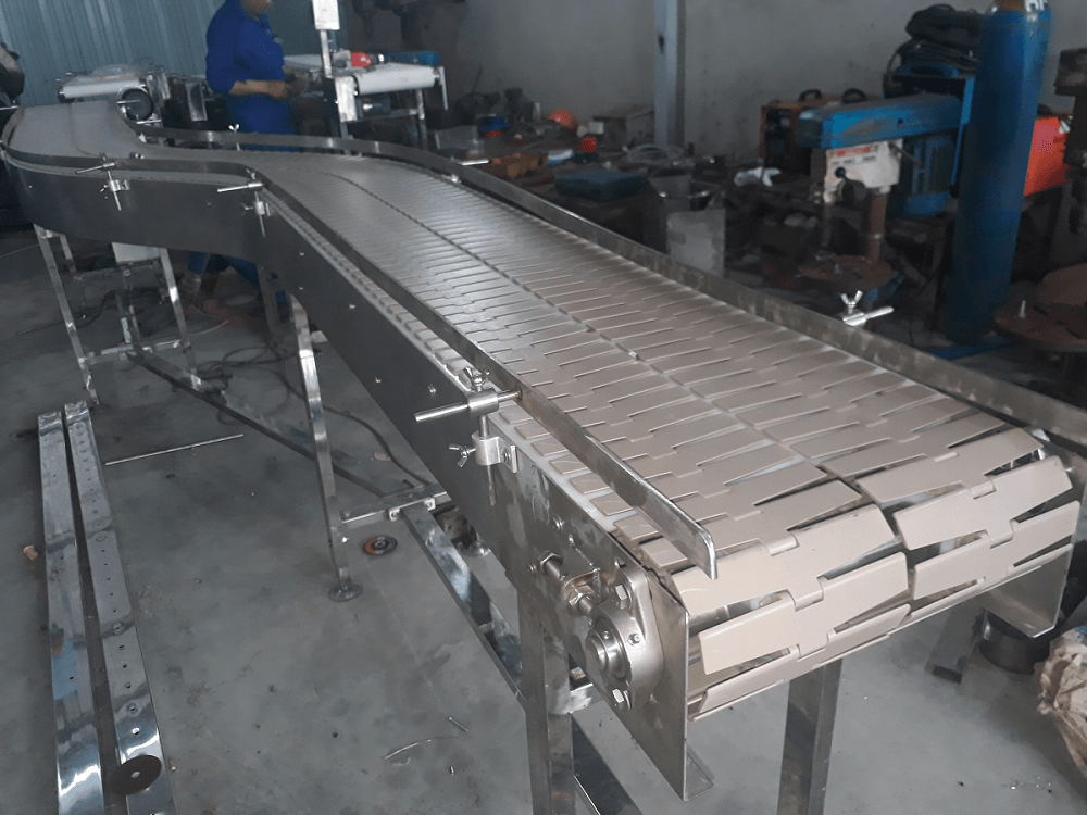 - Băng tải xích nhựa: trọng lượng khá nhẹ, có kết cấu đơn giản vững chắc, độ thẩm mỹ thì lại cao có thể đáp ứng được mọi nhu cầu.