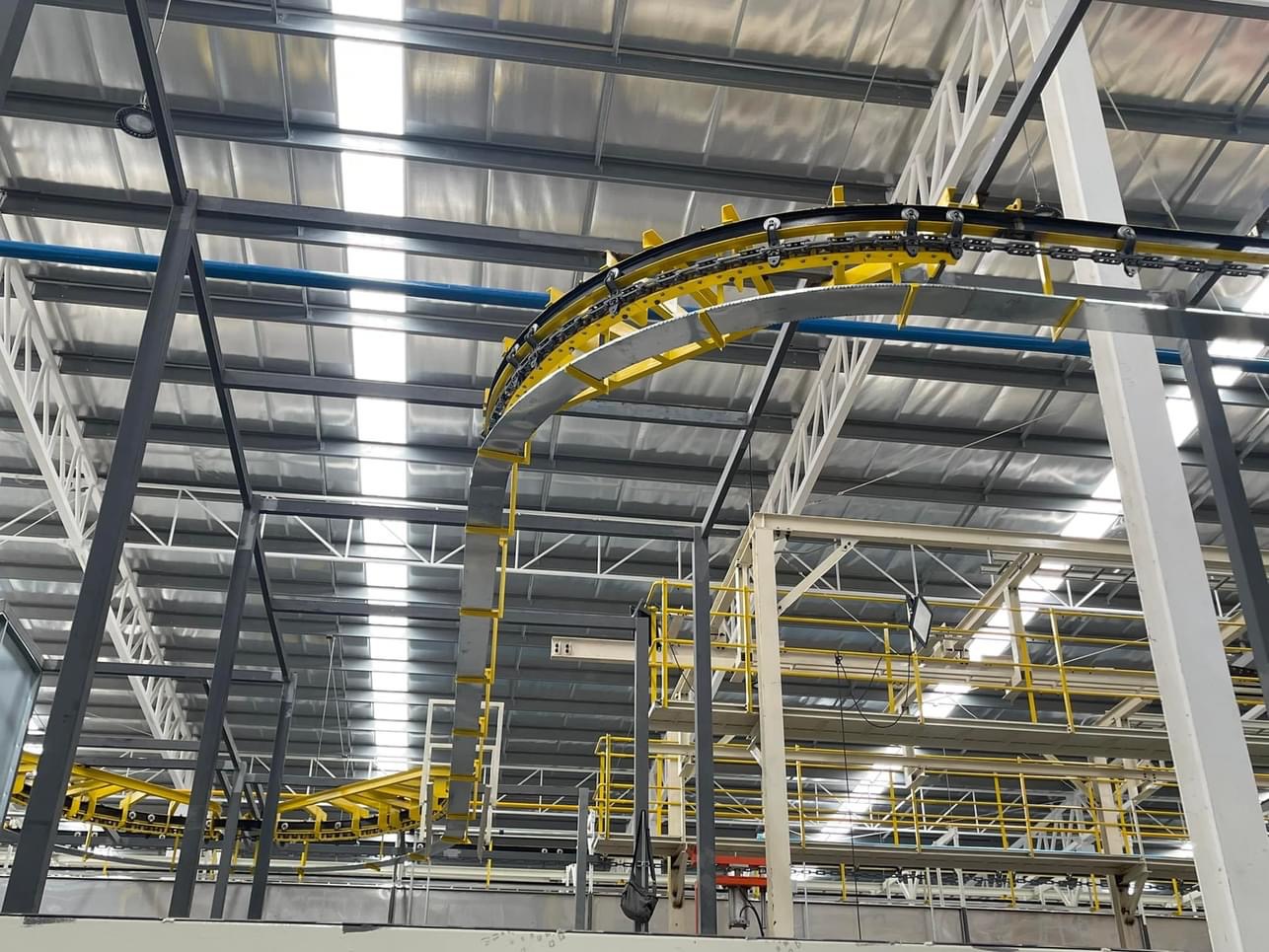 - Băng tải xích treo có thể được lắp đặt trên cao, giúp tiết kiệm không gian sàn nhà xưởng.