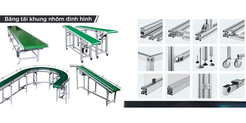 Thường được làm từ thép hoặc nhôm, giúp hỗ trợ toàn bộ hệ thống băng tải và các thành phần khác. Thiết kế chắc chắn để chịu được trọng lượng của vật liệu vận chuyển và các lực tác động trong quá trình hoạt động.