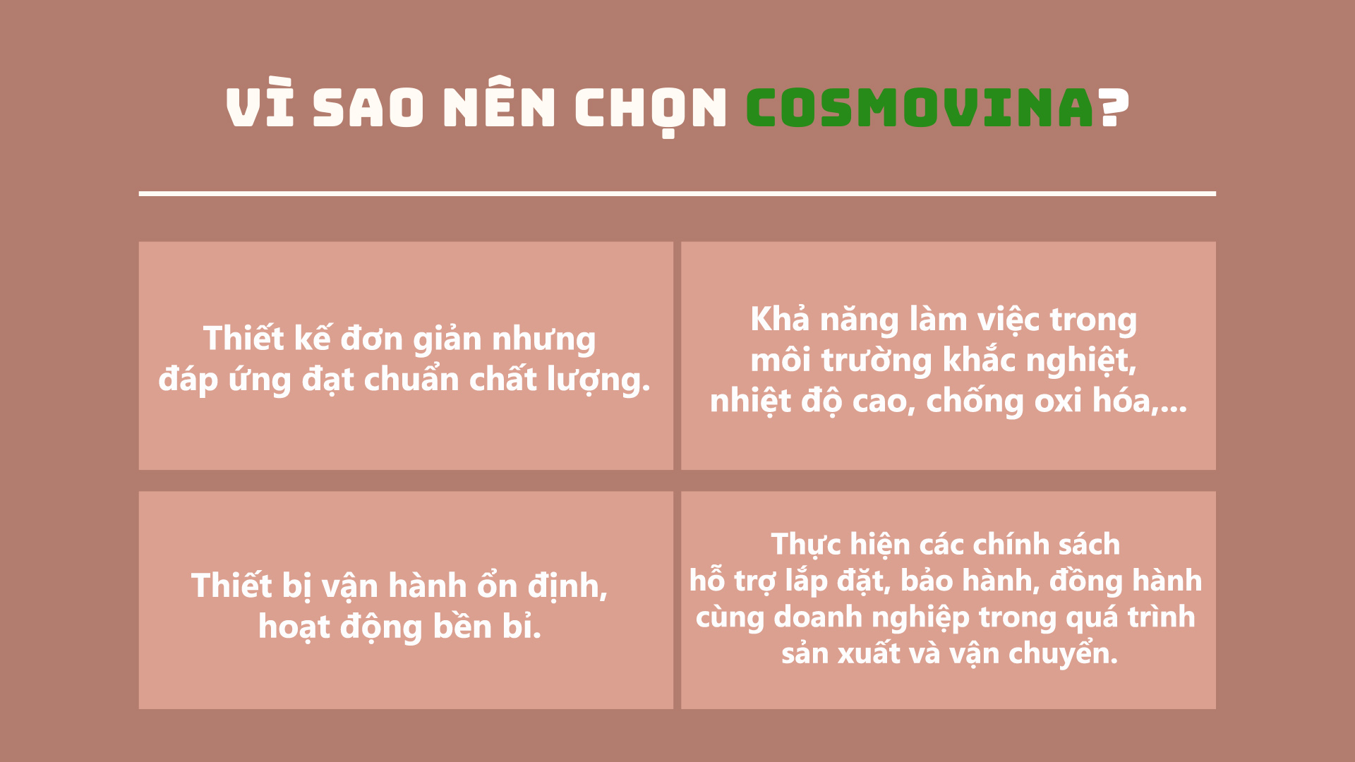 Công ty Cổ phần Vũ Trụ Việt Nam (Cosmovina) là một trong những đơn vị uy tín chuyên lắp đặt băng tải khí nén công nghiệp và các dòng băng tải công nghiệp khác.