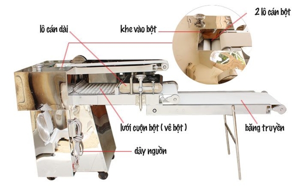 - Lô cán bột: Được thiết kế để cán và làm đều lớp bột, đảm bảo bột được ép mỏng và đồng đều.