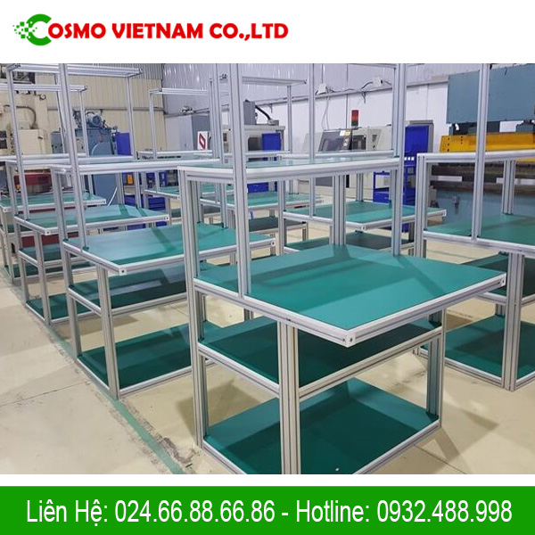 - Bàn thao tác nhôm định hình tại Cosmovina có tuổi thọ cao, độ bền bỉ vượt thời gian, khả năng chịu nhiệt mạnh mẽ
