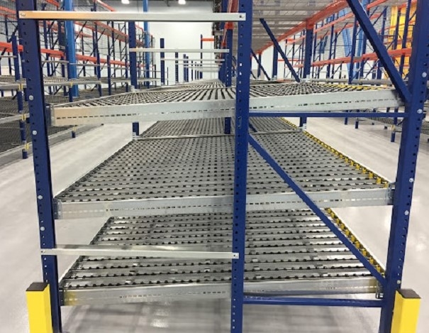 Mặt sàn sử dụng hệ thống con lăn và hơi nghiêng về phía xuất hàng. Do đó, hàng hóa sẽ tự động trượt về phía xuất hàng dưới tác động của trọng lực. Điều này đảm bảo giảm lối đi trong kho xuống mức tối thiểu, tối đa hóa diện tích lưu trữ hàng hóa.